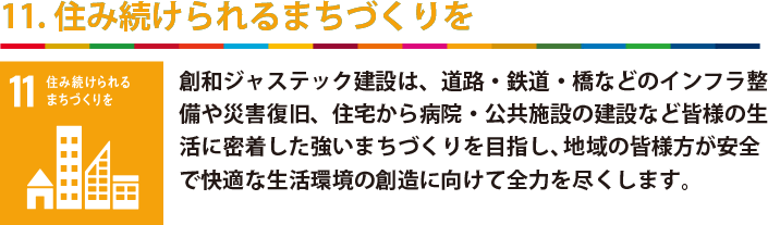 創和ジャステック建設株式会社は「人が安全で豊かな生活・文化を享受したいという願望に答えるべき社会的使命・責任を果たすところに存在価値がある。私たちは、豊かな社会資本整備、快適な生活環境の創造に向けて全力を尽くします。」という経営理念に基づき国連が提唱する持続可能な開発目標を支援し、建設業として地域社会の創造に貢献できるよう活動を推進してまいります。