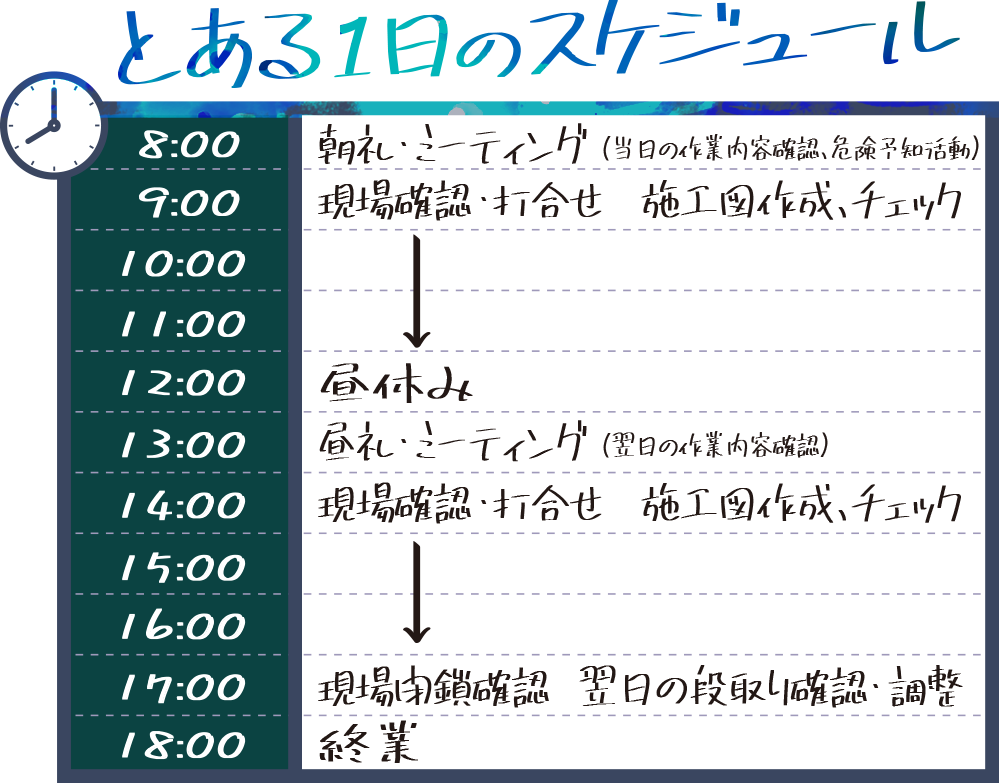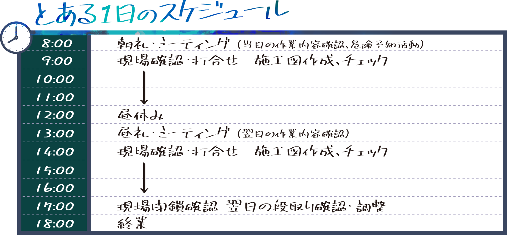 いかに段取りよく、現場の作業を止めることなく、後戻りもなく、完成までまっすぐに進めることが永遠のテーマです。作業内容や使用工具、使い方、必要なことなど、10年経ちますがまだまだ覚えることや知らないこともたくさんあります。職人さんとの会話や自分で調べたり、ときにはやってみたりすることが大事だと思います。自分だけでは完成までたどり着けないので、周りの協力を得ながら、逆に周りから協力される・協力したいと思える人になりたいと思います。