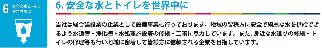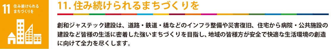 創和ジャステック建設株式会社は「人が安全で豊かな生活・文化を享受したいという願望に答えるべき社会的使命・責任を果たすところに存在価値がある。私たちは、豊かな社会資本整備、快適な生活環境の創造に向けて全力を尽くします。」という経営理念に基づき国連が提唱する持続可能な開発目標を支援し、建設業として地域社会の創造に貢献できるよう活動を推進してまいります。